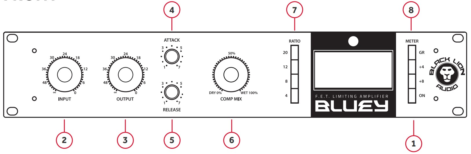 4. 4号旋钮(ATTACK)是Bluey压缩器启动时间的调节旋钮,调节范围为20 us – 800 us,注意这里最左边1的位置是最慢,最右边7的位置是最快;