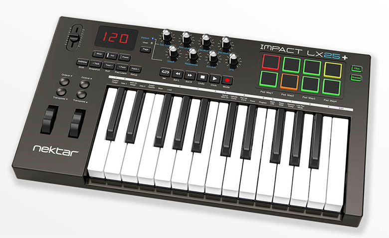 Nektar LX 25+具有更加便携的规格,全尺寸的力度感应键盘设计,还有带有弯音轮,调制轮,推子,旋钮,打击垫。利用面板上的推子、旋钮
