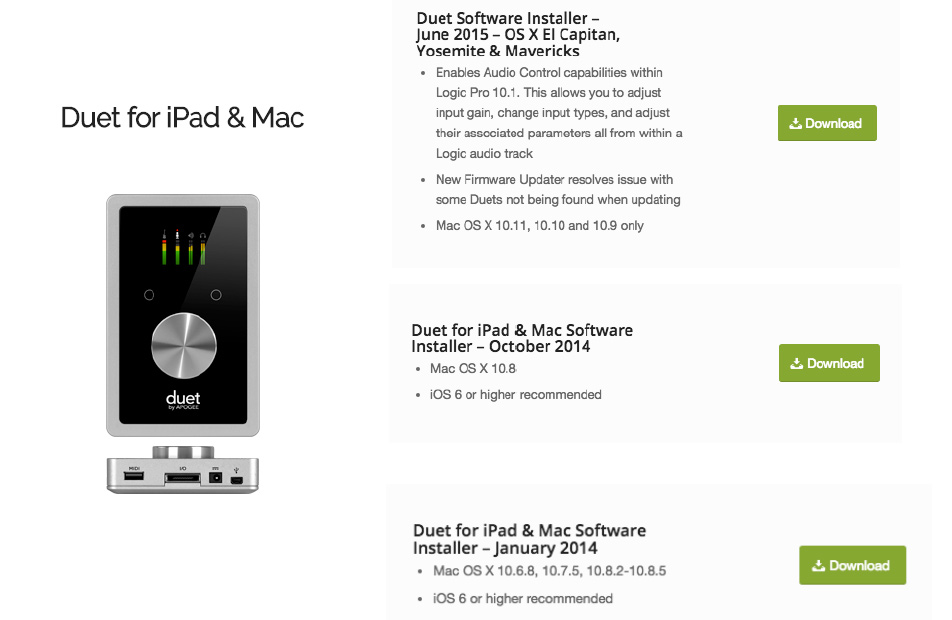 Apogee官方根据苹果客户系统的不同使用需求,目前在其官网上提供了 3个版本的驱动类型,分别依次为 Duet Software Installer – 2015六月版 – OS X El Capitan, Yosemite & Mavericks (支持Logic Pro 10.1、新固件优化—避免吊线、仅支持 MAC OS X 10.11,10.10和10.9系统)、Duet for iPad & Mac Software Installer – 2014十月版( 仅支持 MAC OS X 10.8系统,支持 IOS 6 及其以上系统)、Duet for iPad & Mac Software Installer – 2014一月版(支持 MAC OS X 10.6.8,10.7.5,10.8.2-10.8.5系统,支持 IOS 6及其以上系统)。用户需要根据自己系统的需求选择相应版本的驱动进行安装,以保证之后声卡与系统在使用过程中的稳定。
