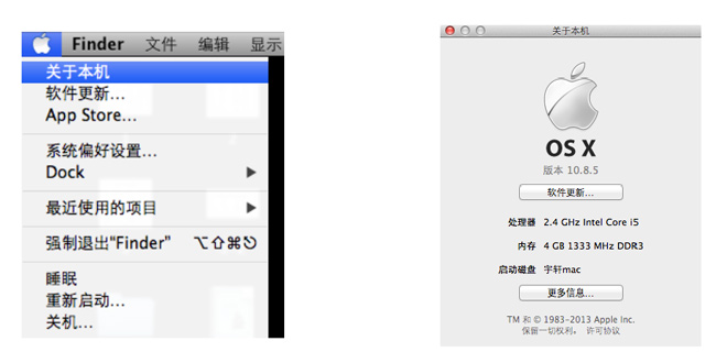 1.点击 MAC 电脑左上角的 苹果图标 > 关于本机,然后即可在新弹出的“关于本机”对话框中查看到你的 MAC OS X 系统,被指南中所使用的 MAC OS X 系统为 10.8.5