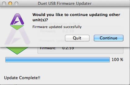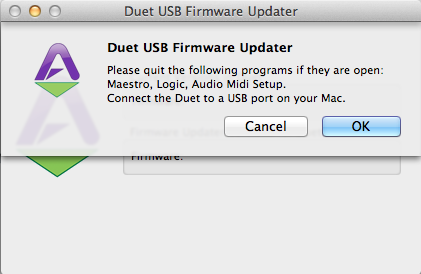 3.打开固件升级程序后会有对话框弹出提示你“退出声卡控制界面、Logic、MIDI设置等相关操作程序的提示,并确认连接你的Duet已经连接了你的 Mac”,如果你已经按照提示完成相关操作,点击“OK”即可