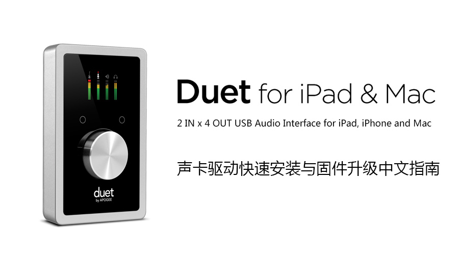 感谢您购买 Apogee Duet for iPad & Mac 声卡(音频接口)产品,此指南内容主要针对使用 Apogee Duet for iPad & Mac 声卡(音频接口)产品的中国用户,为使用户的操作系统与 Apogee Duet for iPad & Mac 声卡更完美的兼容匹配操作,特此由其中国区Apogee产品独家总代理商“北京怡生飞扬科技发展有限公司”提供的“Apogee Duet for iPad &Mac 固件升级中文指南”,从而为购买了 Apogee Duet for iPad & Mac 声卡的中国区用户提供的独家技术支持指南,希望在 Apogee Duet for iPad &Mac 声卡的“驱动选择”、“驱动安装”、“固件升级”方面的使用操作上,可以有效的帮助到使用Apogee产品的中国区用户。