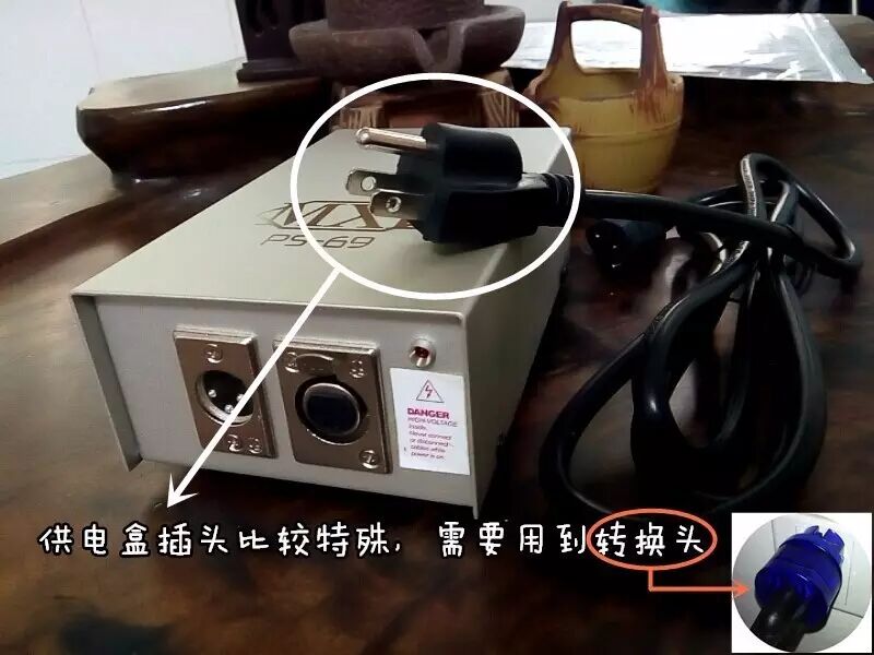 然后是电子管麦克风最重要的一步,接上专用的供电盒,预热一段时间。