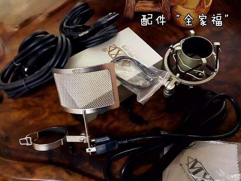 除了电子管麦克风基本的供电盒、专用的电源线以外,还附送了防震架、防喷网和XLR话筒线等等。