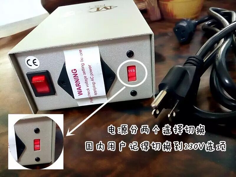 国内使用一定要先切换到”230V“的档位,再接通电源,以免对供电盒造成损伤。