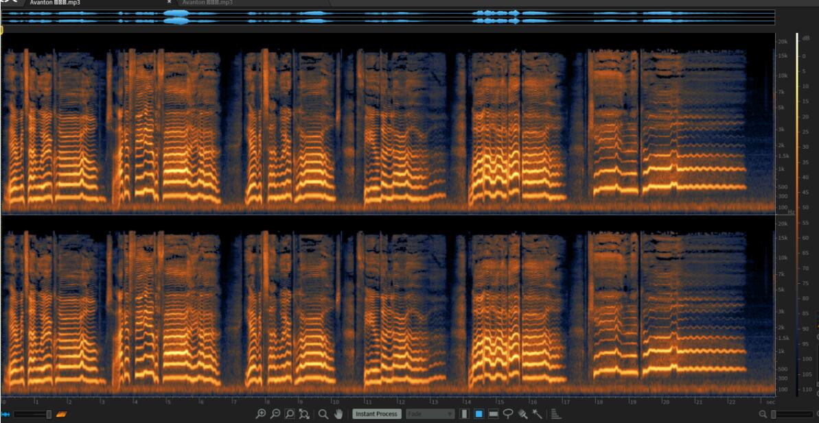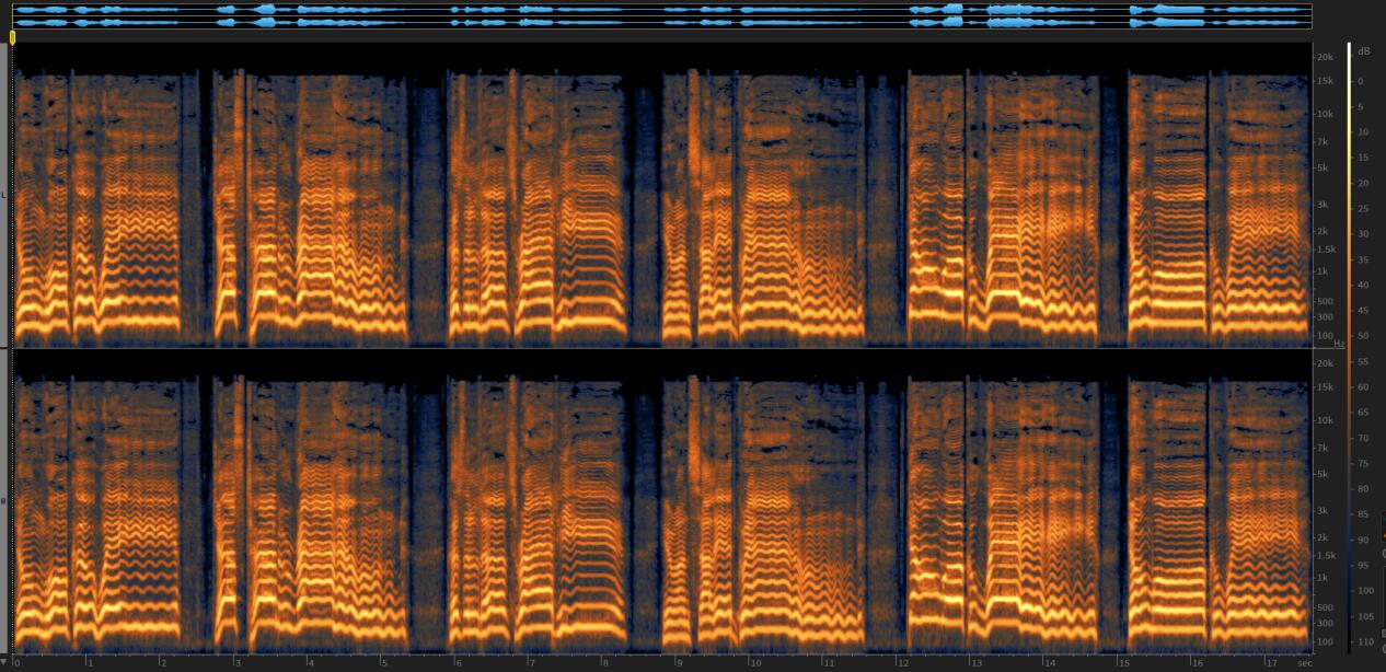 文件格式都是MP3,256码率,48K的采样率,VBR编码。因为是MP3格式,所以不可避免的都会有16K高频削掉的痕迹,但是从所得的录音上,能看出整体的密度是很饱满的,听感上也和我上面的描述是一致的。有一点区别就是,这两个干声是在比较好的环境录出来,会比我在比较宽大而且没有声学装修环境下录出来的要更加的结实,密度感更强。