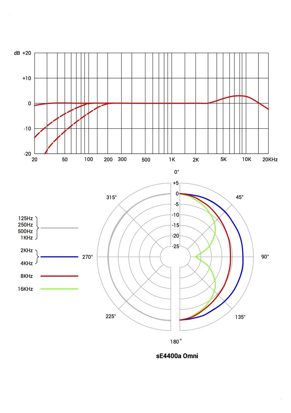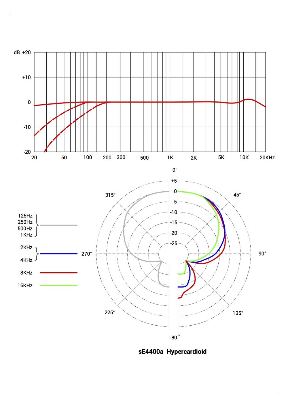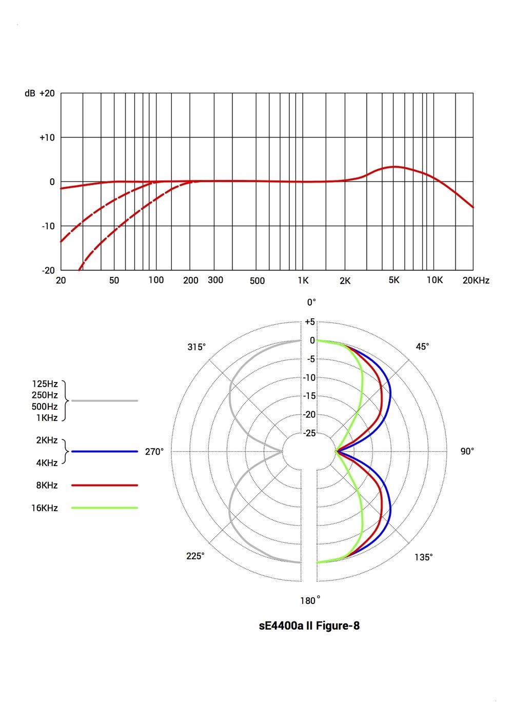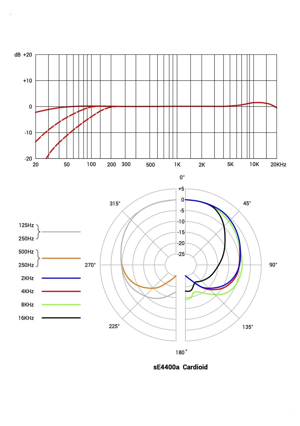 以上就是话筒的技术参数和官方给出的频响图,可以看到使用双振膜的SE4400A具有4个指向性,心型,全指向,八字型,以及在电容话筒上比较少出现的超心形指向,使得这个话筒的使用范围更加广泛,配合-20db的高阻开关,这个话筒在舞台上使用都是没有任何压力的。官方给出的频响图只能作为参考,实际的我们还是得听声音来判断,只看图是没有任何意义的。