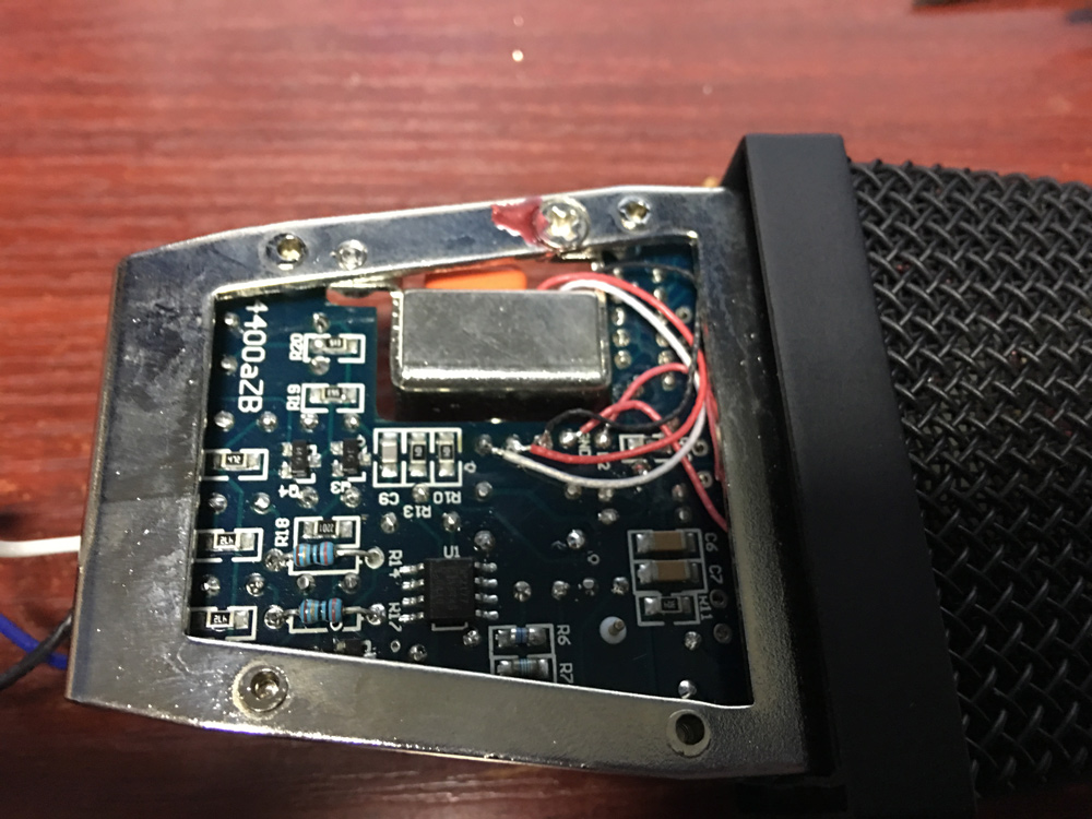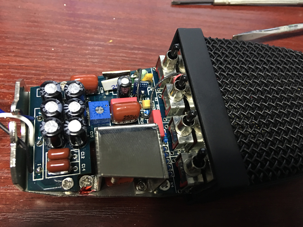 几经周折终于把话筒拆了开来,电路简洁干净,用料中规中矩,不同档次的电容搭配,经典原件搭配现代半导体贴片原件。