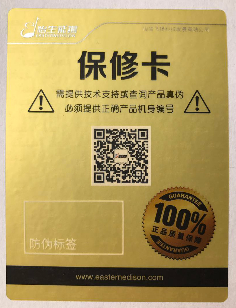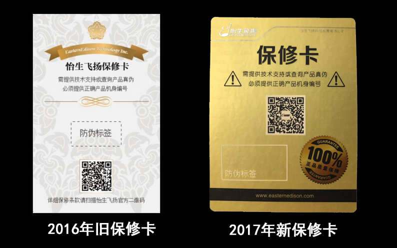 自2017年1月1日起,北京怡生飞扬科技发展有限公司正式启用全新新版产品保修卡,作为购买怡生行货的用户享受保修和售后服务之凭证。旧版保修即日起将不再使用,如果您从怡生飞扬经销商处购买的产品依然贴有旧版保修卡,可拨打怡生飞扬售后服务电话通过产品序列码查询真伪(注:在新旧版保修卡更替过程中,可能出现部分产品没贴有怡生保修卡,但声称为怡生行货的,为了您的自身权益请通过怡生飞扬售后服务电话进行查证,给您带来的不便敬请谅解)。怡生飞扬售后服务电话:010-65860065转8219。