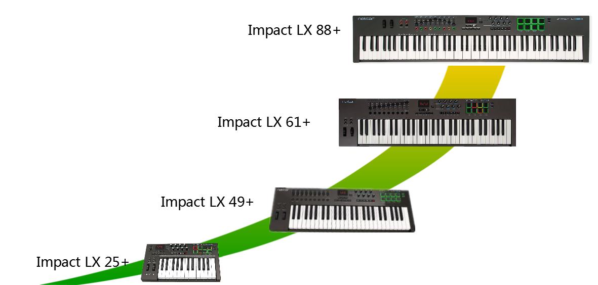 Nektar Impact LX+ 系列一共分为4个型号,88键的 LX88+,61键的 LX61+,49键的 LX49+,25键的 LX25+。