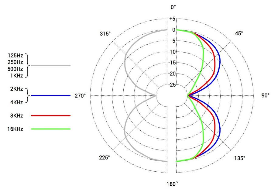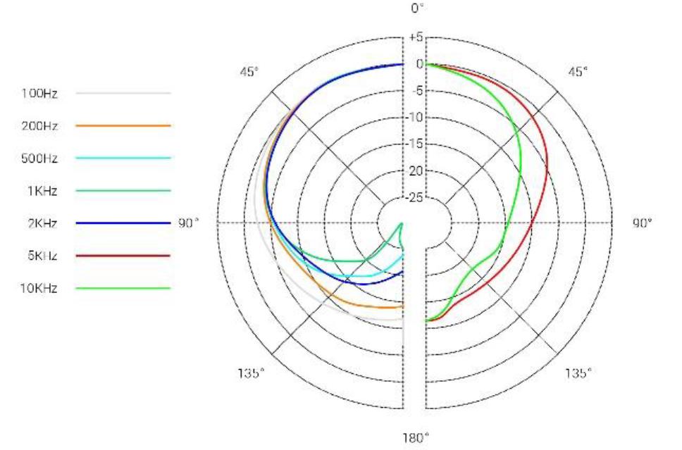 心形指向的话筒对正前方的声音的接收效果最好,会拒收一部分周围和背面的声音。上图形长得像一颗心,这就是心形指向性的形状,它能够有效减少来自侧、后方的声音,所以在多声道、多话筒录音中适合使用这种类型的话筒。它不适用与捕捉房屋环境的大范围背景声。这种类型的话筒常见与录音棚和现场演出,因为它可以有效拒收话筒后方反射,削减回授和环境噪声,因此心形话筒在话筒应用中占比非常大。需要特别注意的是,就像所有非全指向话筒一样,心形话筒会产生近讲效应(话筒距离音源很近时会增加其对低频成分的响应)。