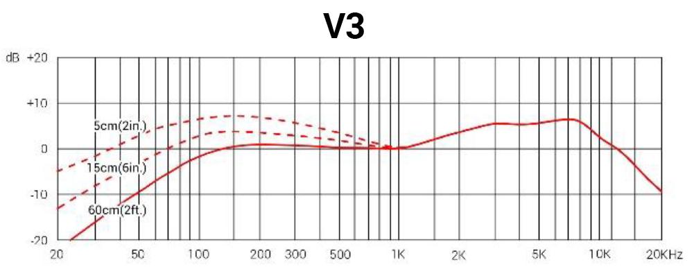 通过V3的频响曲线我们很容易可以发现首先它很适合拾取军鼓的声音,它从150Hz到1KHz的频响非常的平坦,或者可以说是中性。换句话说,理想状况下在这个频段收录进的声音,跟你直接从相应距离听到的声音是一样的——不会有什么变化。中高频部分的提升特别适合表现军鼓音色清脆的那一部分,同时它的低频滚降可以很好地大力减少来自底鼓的声音,鼓组各组件之间的距离都是很近的。这款话筒的频响曲线是很多录制军鼓的工程师所寻觅的——既可以还原军鼓大部分的原始音色,又可以提升它出彩的一面,同时减少来自近距离底鼓的低频干扰。