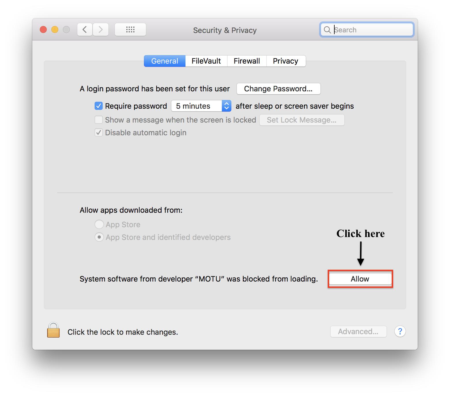 - 在通用栏(General),找到跟MOTU相关的信息(…..”MOTU”……loading)点击允许(Allow)