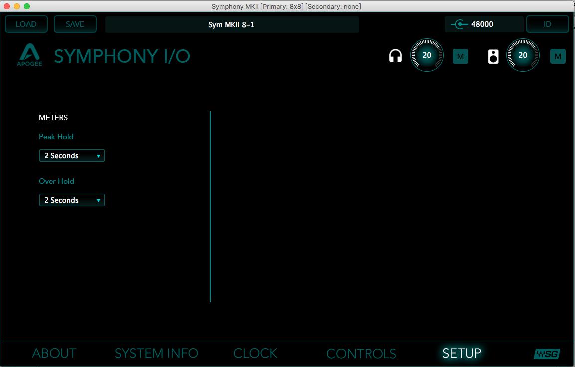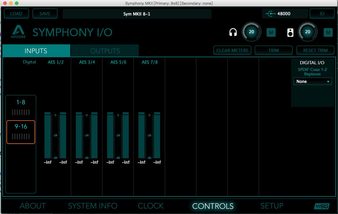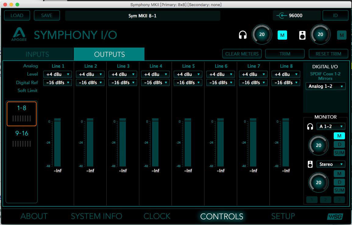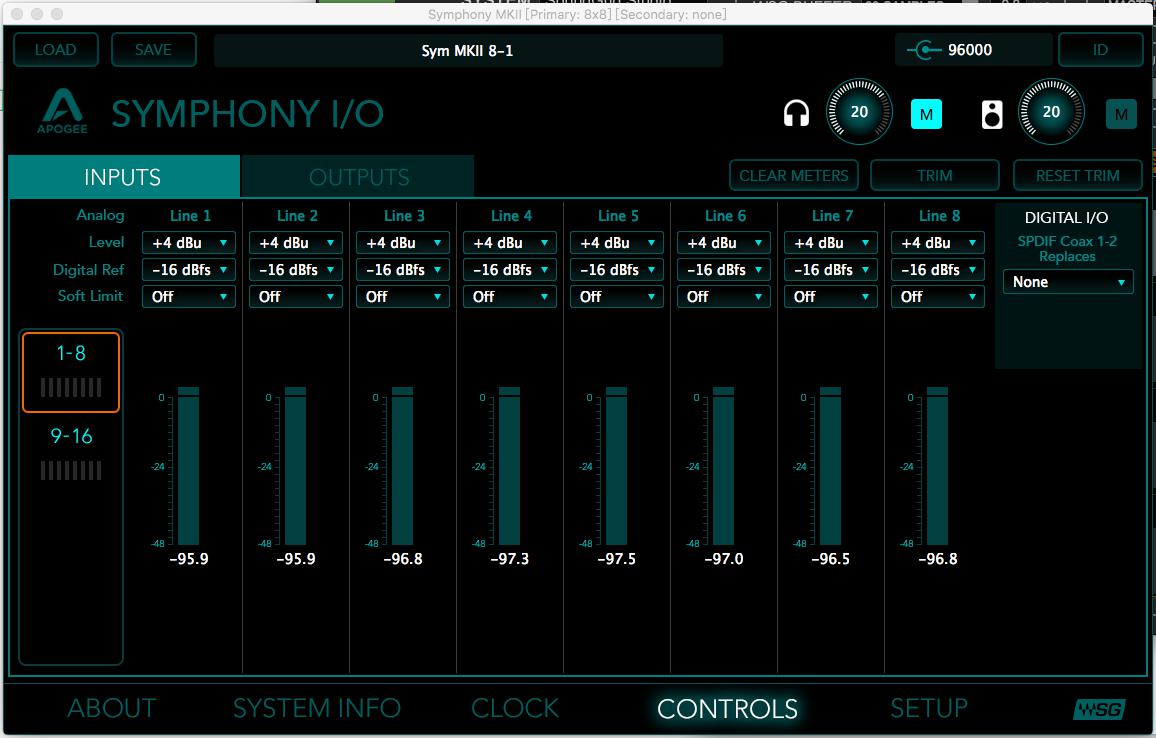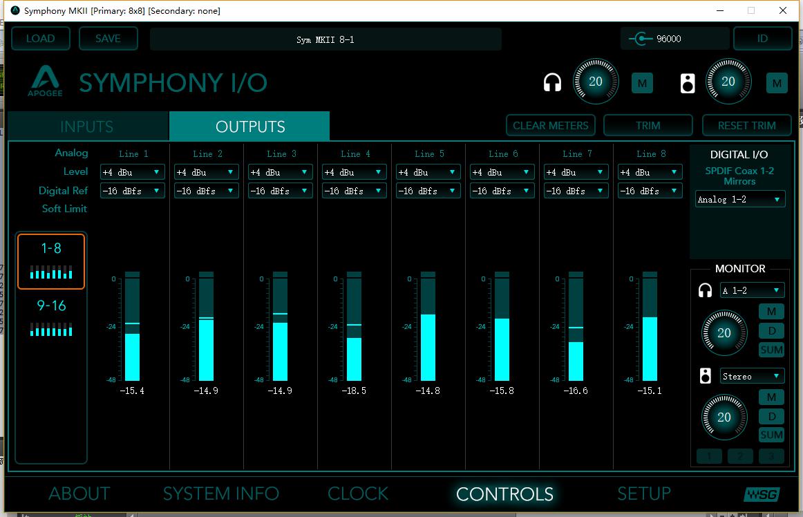WSG下的Symphony控制面板如下图,仍包含完整的控制功能,包含每通道数字参考电平设置,软限制器,线路电平增益调节(TRIM,±2dB)等