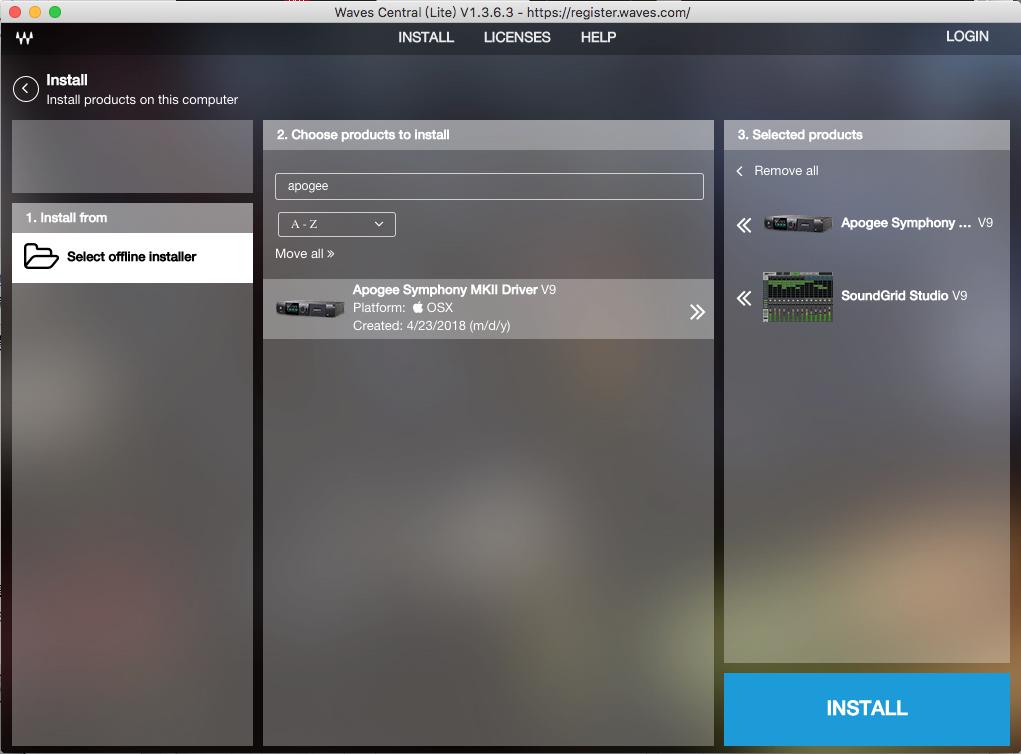 搜索“Apogee Symphony MKII Driver”与“SoundGrid Studio”,选中将其添加到右侧安装列表,最后点击右下角“INSTALL”开始安装。