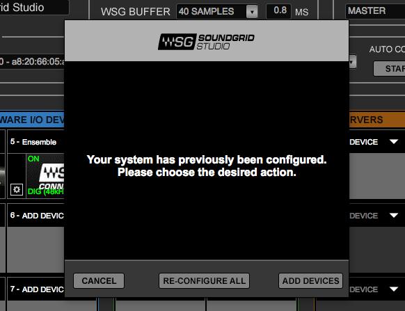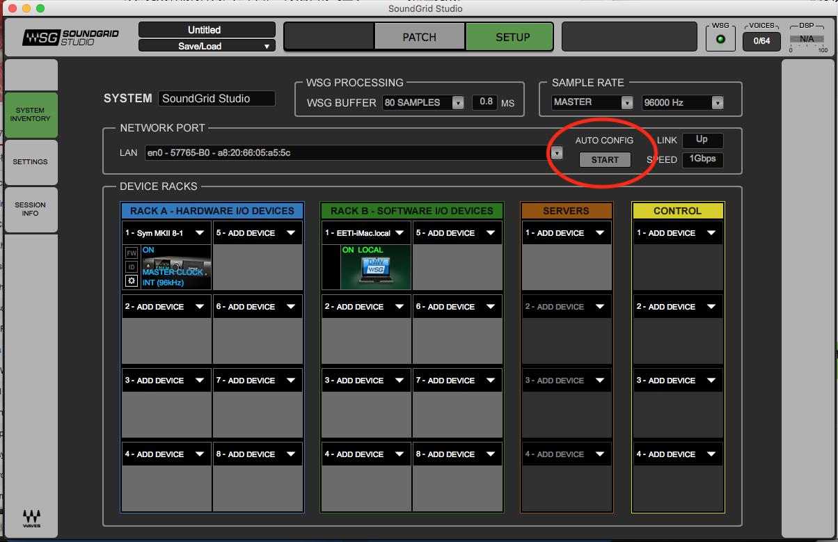 首次开启SoundGrid Studio时会弹出自动配置向导,可以为用户自动搜寻当前的SoundGrid连接与设备并自动添加。若想使用该自动配置功能,我们也可以点击“AUTO CONFIG”下方“START”按钮使用自动配置向导进行设置。
