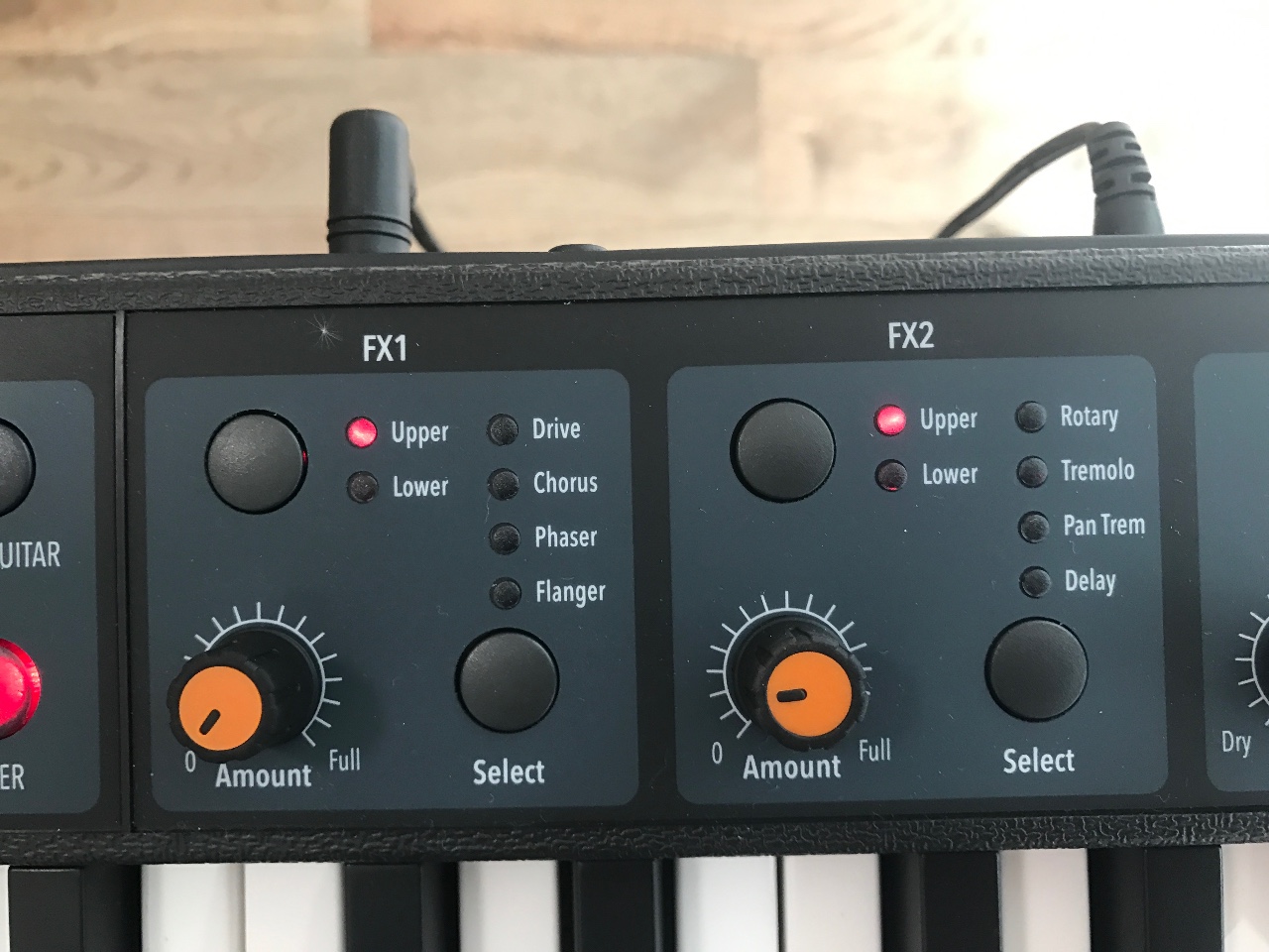 音色效果:FX1和FX2区域面板也是方便直观,就好像两个吉他效果器单块(和声、失真、混响等)的浓缩版,两个面板都分上层音色和下层音色,按知己的喜好用旋钮调节堆叠程度。效果也不要纠结,只是锦上添花。