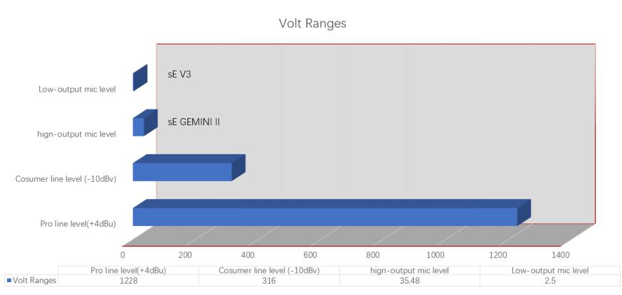 一般来说音频工作者会遇到三种常见的电平表达方式,现场或录音通用,下图给出的就是常见信号强度图表。其中信号强度最小的是动圈麦克风,这里列举现场用sE V3;比动圈麦克风强出很多但是远不及线路级别信号的是电容麦克风,这里列举双电子管电容麦克风sE GEMINI II;在信号等级上明显强出很多的是线路级别信号了,民用领域通常使用-10 dBv信号层级,强出各种原始拾音设备不少,但是相比专业音频领域常用的+4 dBu信号,强度就小太多了。