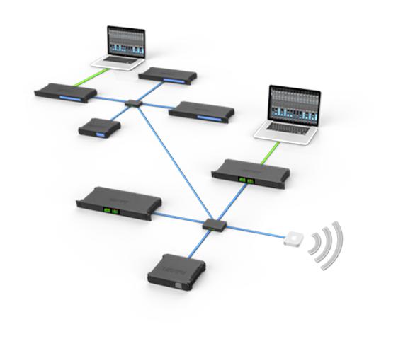 通过多台音频接口,电脑,标准的AVB/TSN交换机以及网线可以构建一个音频网络系统,在长距离(点对点100米)的情况下,也能保持极低的延时。