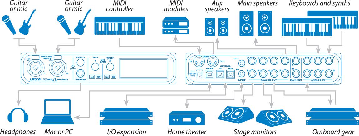 UItraLite-mk4能够连接所有的音频设备,适用场合非常广泛,包括扬声器,耳机,麦克风,吉他,合成器,键盘,鼓机,效果处理器,甚至MIDI设备。