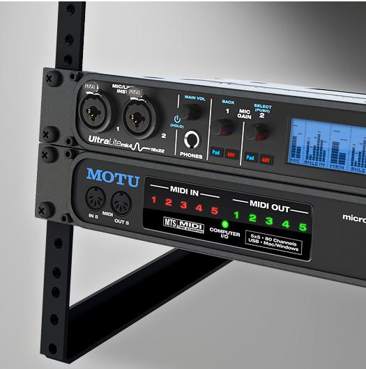 UItraLite-mk4搭配相应的安装配件可以组装在支架上,与另一台MOTU micro lite MIDI音频接口可以组装成下图所示,