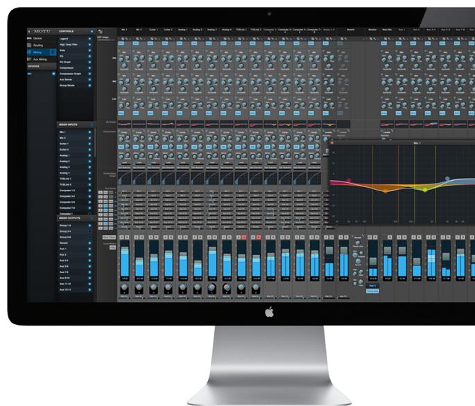 你可以通过Thunderbolt™, USB 2.0 或AVB/TSN Ethernet连接你的Mac或PC电脑,最高可达256个音频通道(128输入,128输出)。