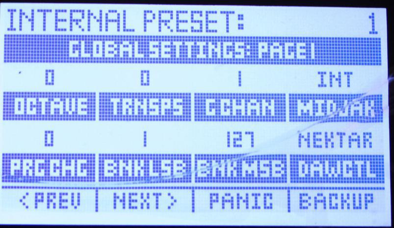 因为这两个按键不再是半度移调,如果需要使用半音移调功能,同时按两个8度移调按键(Octave),然后屏幕就会出现全局设置,第一个参数控制是8度移调(OCTAVE),第二个就是半音移调了(TRNSPS),这里的参数可以用旋钮来修改。