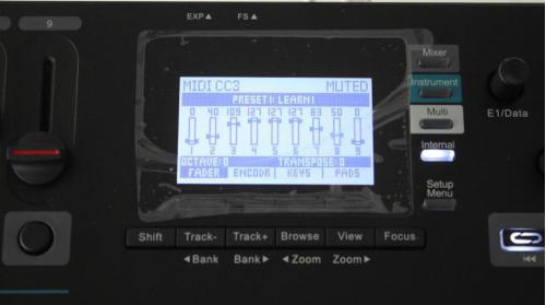 屏幕右方有5个模式按钮,模式按钮分别是调音台模式(Mixer)、乐器模式(Instrument)、多参数模式(Multi,用于Nektarine控制)、内部模式(Internal)以及设置按钮(Setup Menu)。调音台模式下,推子旋钮按钮就是整一个调音台,推子控制音量,旋钮控制声像,按钮控制静音和独奏,很好理解。而到了乐器模式,推子旋钮按钮都变成控制音源的参数。多参数模式主要是用于控制Nektarine。(莫急,下面会说Nektarine的)内部模式就是把T6变成一台普通的MIDI控制器,自己去映射功能。设置按钮则是控制一些键盘设备的参数了。