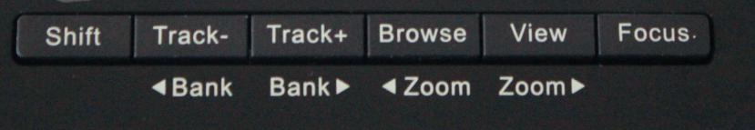 第二功能的切换按键,例如旁边的Track-和track+按键原本是选择上下一条轨道。下面印着Bank这个功能,我只需要按着shift按键再按Track按键就即可启用。Bank这个功能是切换上下8轨,配合推子旋钮使用,控制另外8轨以外的参数(9个推子中,最后一个是控制主音量,其余8个推子分别是1-8轨的音量)。Browse能搭配nektar推出的新插件Nektarine 使用,当使用Nektarine的时候,browse按键能直接进入Nektarine的浏览界面,非常方便。Nektarine在下面我会进行说明。View按键也是非常强大,可以直接呼出轨道的插件菜单,从而可以方便地去控制、观察插件参数。下面的Zoom按钮就是用于放大缩小宿主的主界面。Focus按键可以让显示屏用大字体显示当前参数,这功能对用于演出的朋友非常友好,一眼就能看到现在控制的是什么参数。