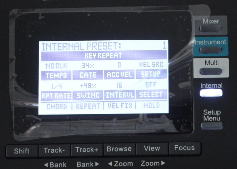 Key Repeat点击开启,而Pad Reapeat长按生效。Reapeat参数可以在Intemal(内部模式)里的KEYS或PADS下修改,例如拍子、门限,swing等都可以修改。