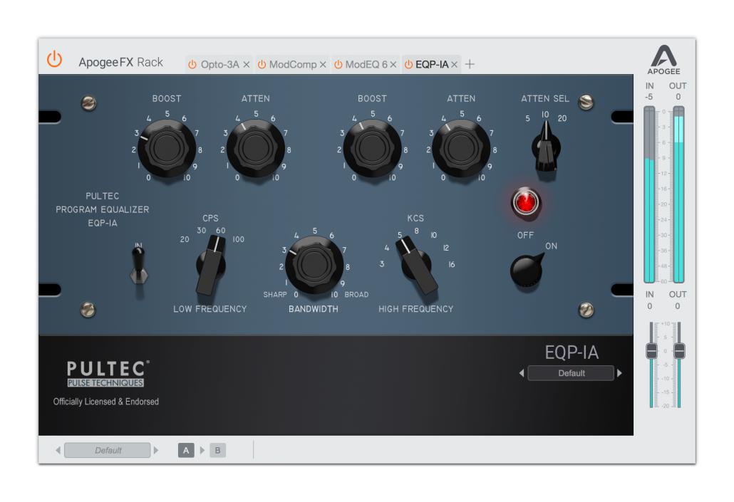 EQP-1A是基于经典的Pultec EQP-1A均衡器设计,使用最先进的数字建模技术,精确还原每一个原始硬件的信号处理特征和处理流程。EQP-1A插件取得了Pultec公司的正式授权,由Apogee和Pultec双方的音频工程师共同开发,并完全沿用了EQP-1A的命名,代表其拥有不亚于硬件设备的声音特性和品质。