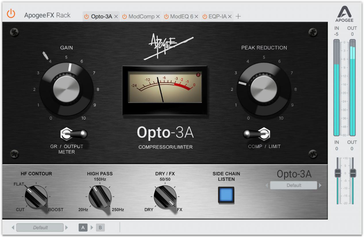 ModComp是Apogee全新开发的高品质现代风格可视化压缩/限幅器插件。具有现代压缩/限幅器典型的快速响应特性,三种处理强度模式可选,两段侧链触发EQ,自动增益补偿,干湿比调节等适合现代音乐编辑工作流程的功能。