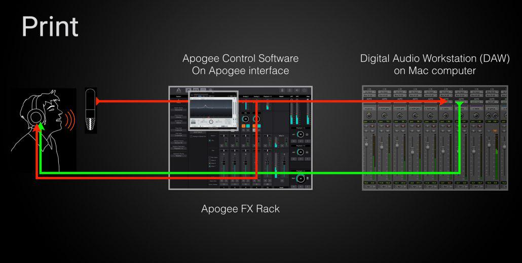 在渲染工作流下,你必须连接Apogee硬件,使用硬件自带的DSP处理芯片进行Apogee FX Rack插件运算工作。你需要在Apogee Control软件控制界面内加载Apogee FX Rack,调整好你需要的处理效果,之后将处理后的声音录制进入DAW中。这就像是在使用一台真正的硬件处理设备一样!