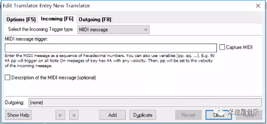 点击【New Translator】进去,就会出现下方的界面,在【Incoming】里面就是把MIDI键盘输入的MIDI信息录进去(需要勾上【Capture MIDI】)