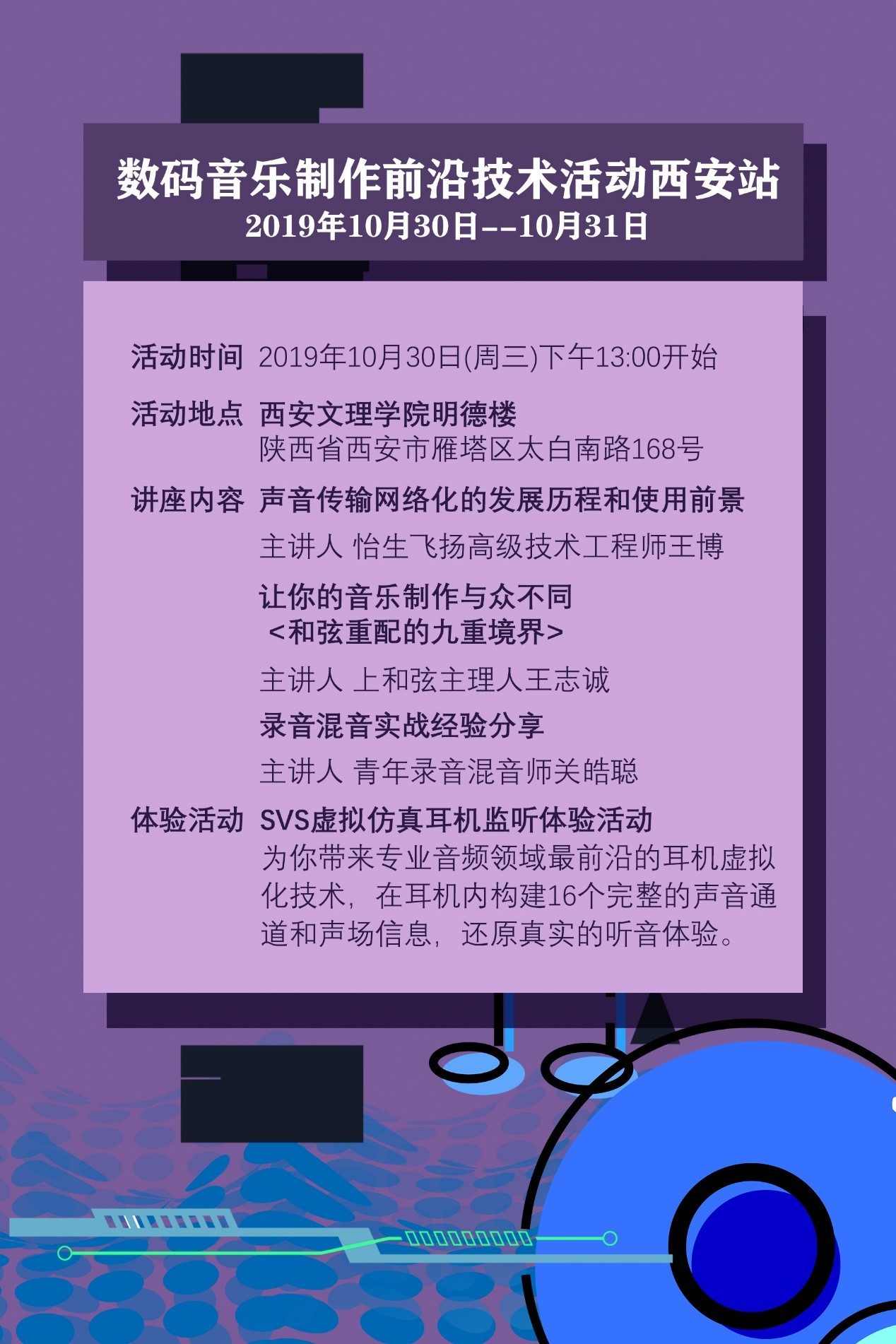 本次活动以数码音乐制作与前沿技术分享为主题,将数字时代的模拟录音与混音、全息声技术、SVS虚拟仿真耳机技术等前沿音频技术带进高校,开阔高校师生们的眼界,增进前沿技术与学术殿堂的交流互补。10月30日至31日西安文理学院将汇集众多专家学者及业内人士分享音频技术前沿信息,欢迎高校师生以及业界专家学者莅临交流体验。