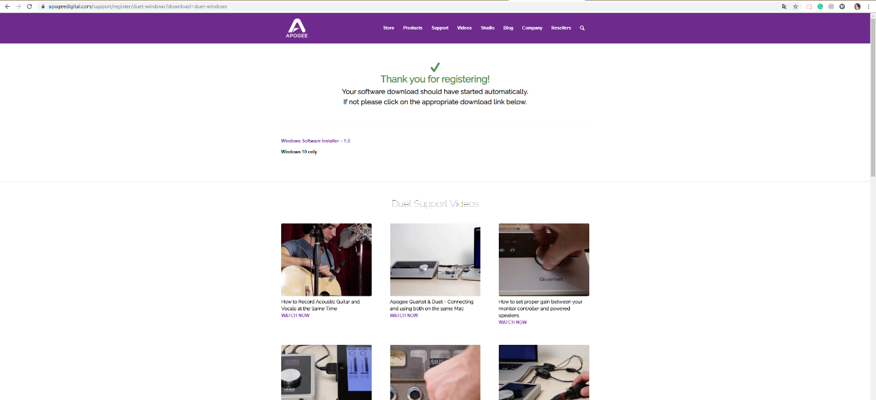 在拿到购买的产品后,第一时间前往Apogee官方网站进行产品注册,以便获得产品驱动下载地址以及促销活动赠送的软件产品激活码。具体操作步骤如下: