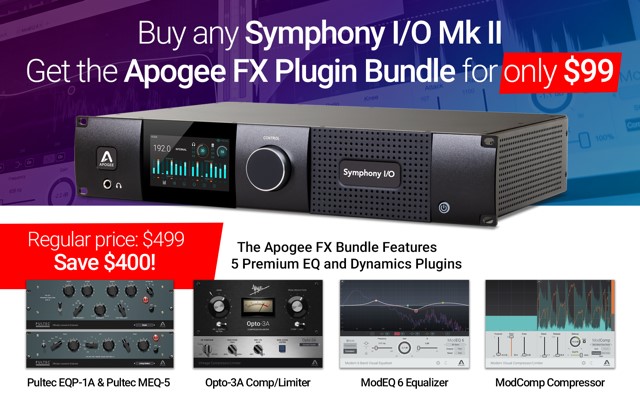 活动内容:于活动期间购买Symphony I/O Mk II系列接口产品,将以99美元(原价499美元)的特别价格获得Apogee FX插件套装 Apogee FX套装包含以下软件: ● Pultec EQP 1A ● Pultec MEQ5 ● Opto-3A ● ModEQ 6 ● ModComp 活动时间:2020年6月1日至8月31日 |