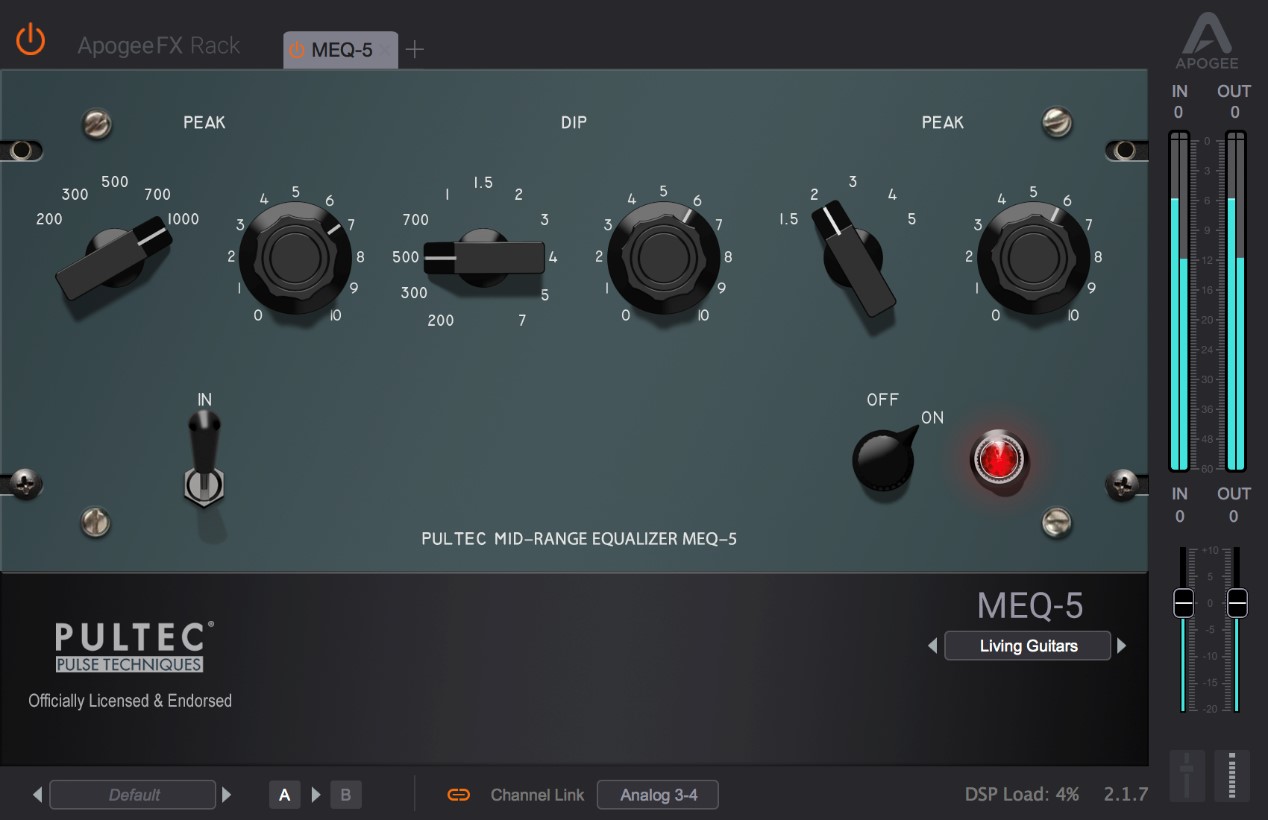 EQP-1A是基于经典的Pultec EQP-1A均衡器设计,使用最先进的数字建模技术,精确还原每一个原始硬件的信号处理特征和处理流程。EQP-1A插件取得了Pultec公司的正式授权,由Apogee和Pultec双方的音频工程师共同开发,并完全沿用了EQP-1A的命名,代表其拥有不亚于硬件设备的声音特性和品质。