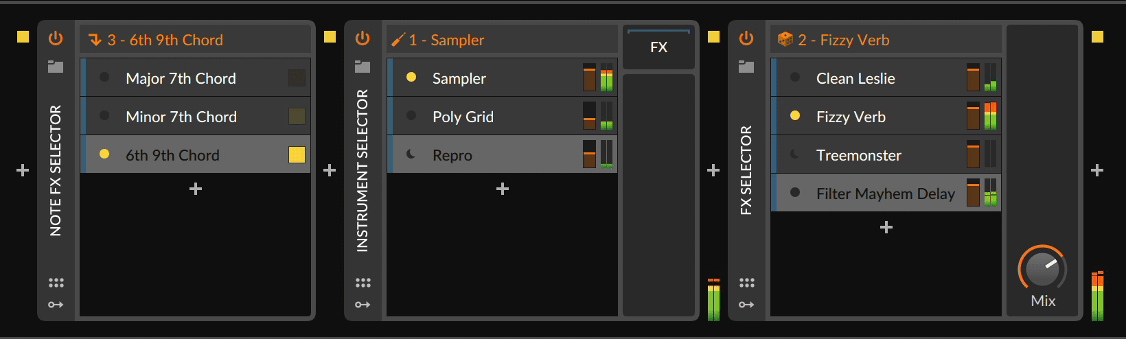 Instrument Selector、Note FX Selector和音频FX Selector现在全部可用voice模式,将获得动态化的分层触发。无论是一个和弦的每个音符需要不同的预制还是完全不同的VST,新模式都将轻松处理这些细节。同样,琶音器可实现复合节奏,音频效果可多重汇聚并平滑过渡。
