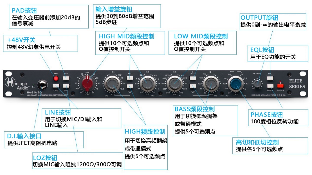 Heritage HA-81A采用高品质电位器和开关按钮组件,就像Elite系列中的所有产品一样,HA-81A的制造和设计采用了最先进的工艺和理念,并且忠实还原经典设备的声音风格,具有出色的声音品质,坚持欧洲本土生产装配。