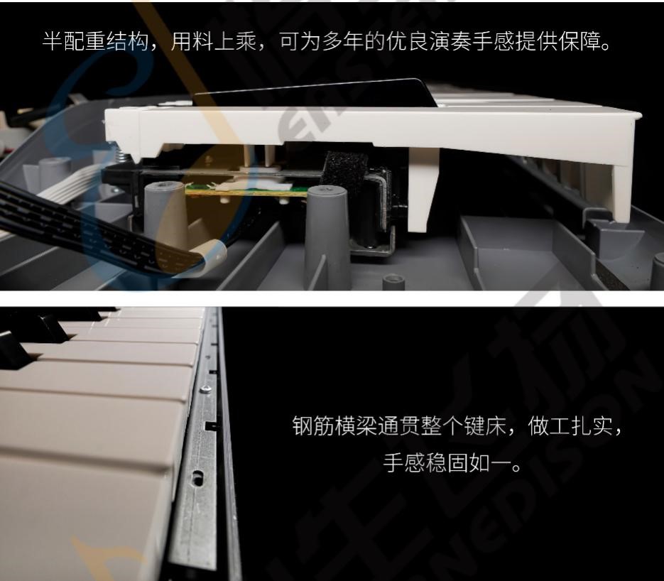 - 88音符全尺寸半配重键盘,具有力度和触后功能