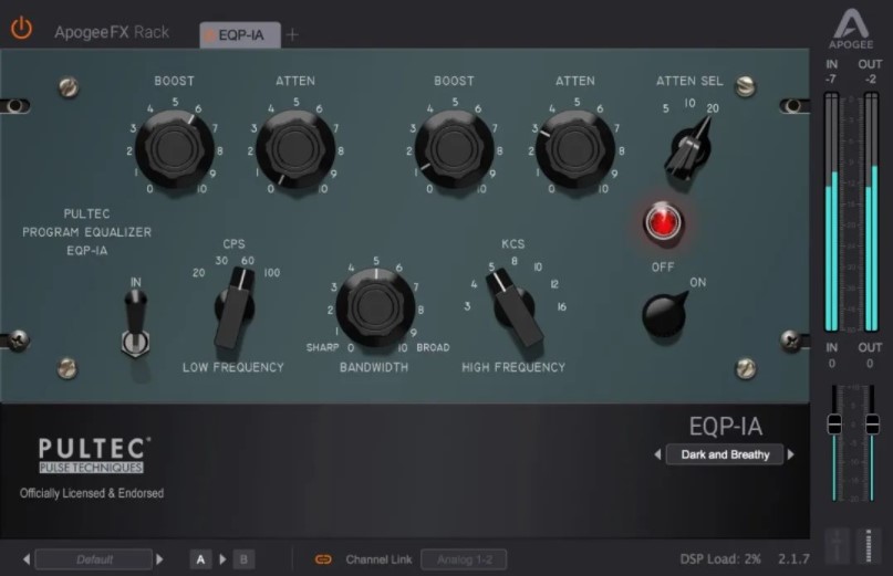 EQP-1A是基于经典的Pultec EQP-1A均衡器设计,使用最先进的数字建模技术,精确还原每一个原始硬件的信号处理特征和处理流程。EQP-1A插件取得了Pultec公司的正式授权,由Apogee和Pultec双方的音频工程师共同开发,并完全沿用了EQP-1A的命名,代表其拥有不亚于硬件设备的声音特性和品质。