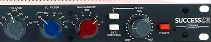 - Successor带有两个顺应现代音乐压缩处理趋势的重要功能,分别是Sidechain Filter(内部侧链滤波器,图中的SC. FILTER旋钮)和Blend(干湿比调节)。
