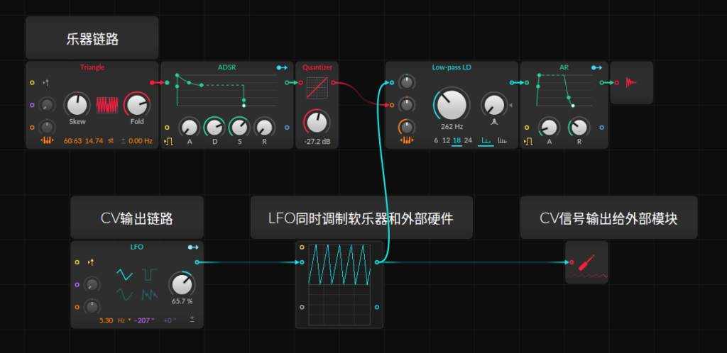 4,在Bitwig中建立一个软件乐器轨,选择的插件就是其内置强大的The Grid软件模块环境。在其中先随意搭建一组合成器乐器链路。然后在平行搭建一组将LFO信号CV输出的链路。然后将LFO的调制也发送到乐器链路Filter的Cutoff。