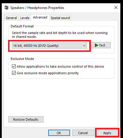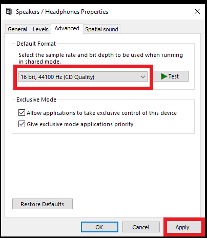 在“属性”>“高级”>“默认格式”中,从当前设置更改为另一个设置,然后返回,在每次更改之间单击“应用”以确保保存更改。