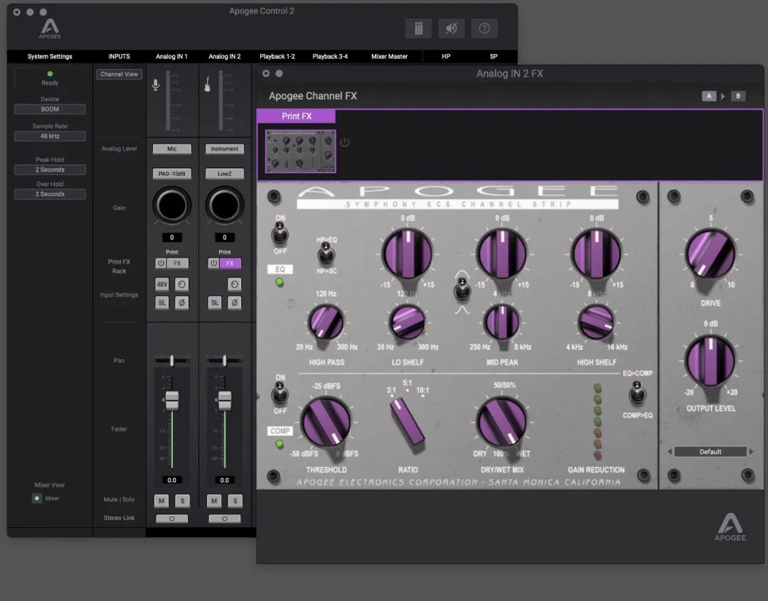 Apogee BOOM板载DSP效果器。由格莱美级混音师Bob Clearmountain调教的ECS话放通道条轻松将EQ、压缩、过载效果器打包助力你的录音作品,使其具有温暖、颗粒的模拟质感。