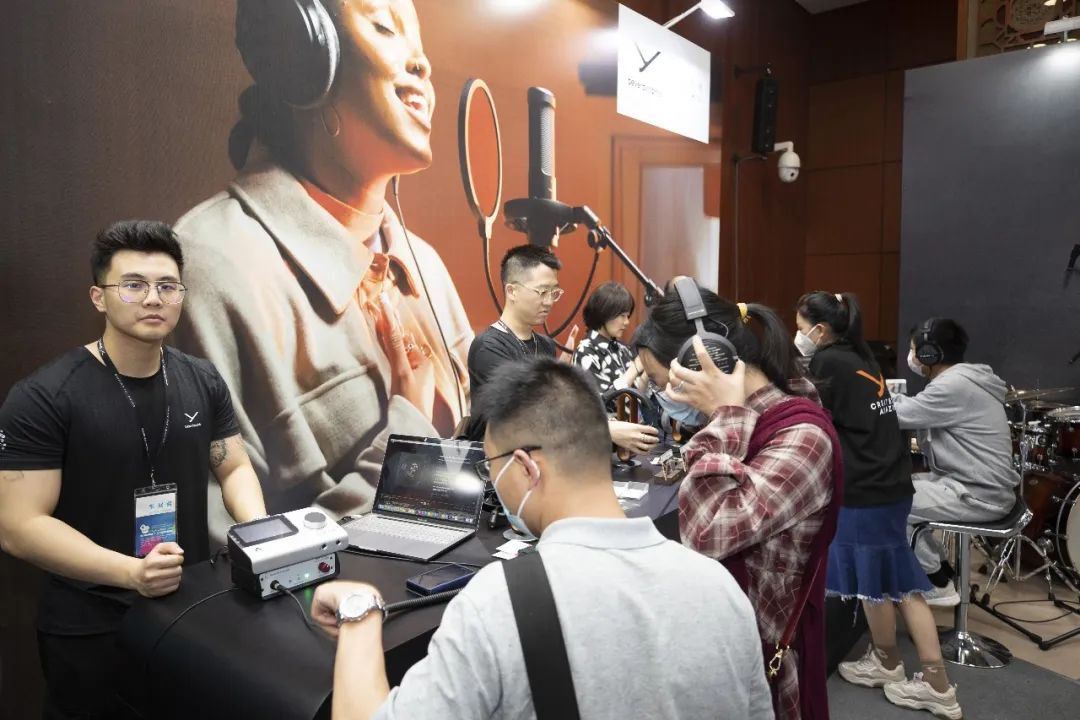我们搭配的试听系统包括行业顶尖的Apogee Desktop声卡、Groove解码器以及尼夫RNHP耳放,配合拜雅耳机中性、自然的风格,受到现场爱好者一致好评。现场还有歌声靓丽的小姐姐来试用了多款话筒&耳机型号。我们来一起回顾一下现场的精彩瞬间: