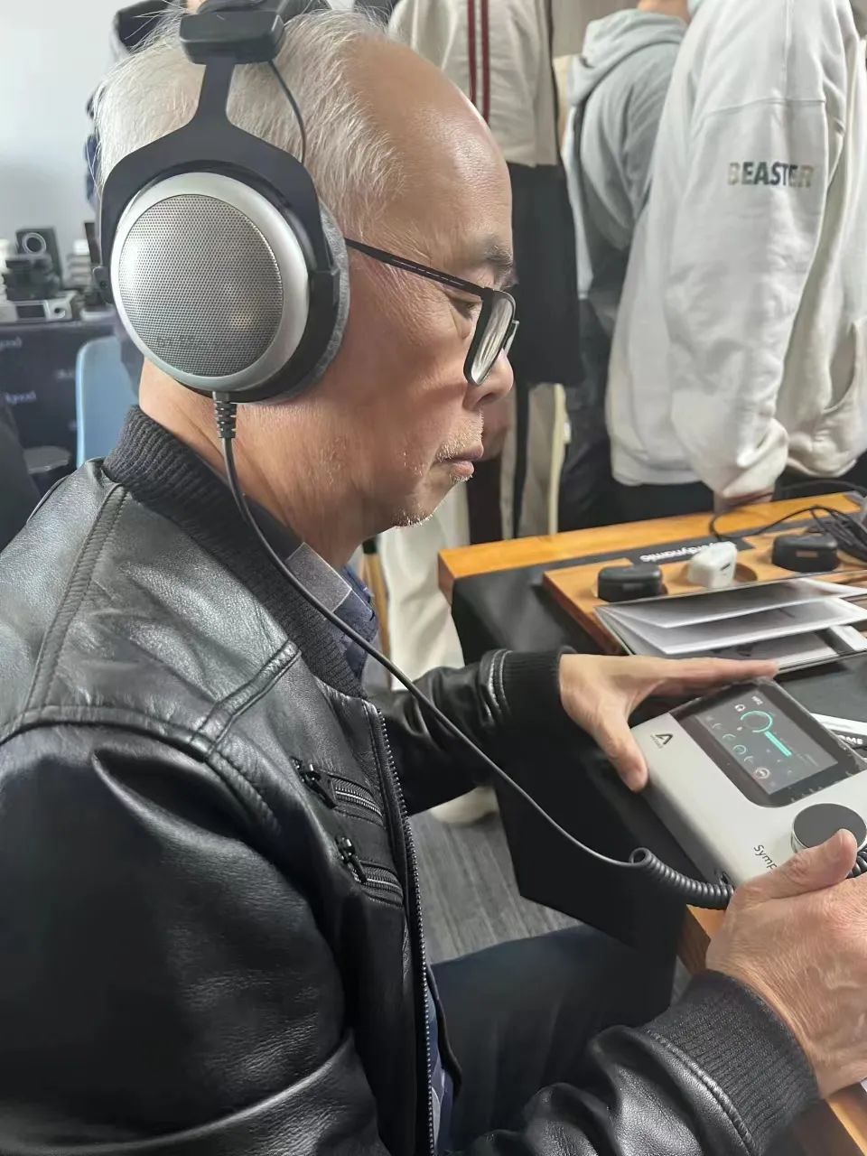一位武汉音乐学院的老教授在认真聆听拜雅DT880耳机。