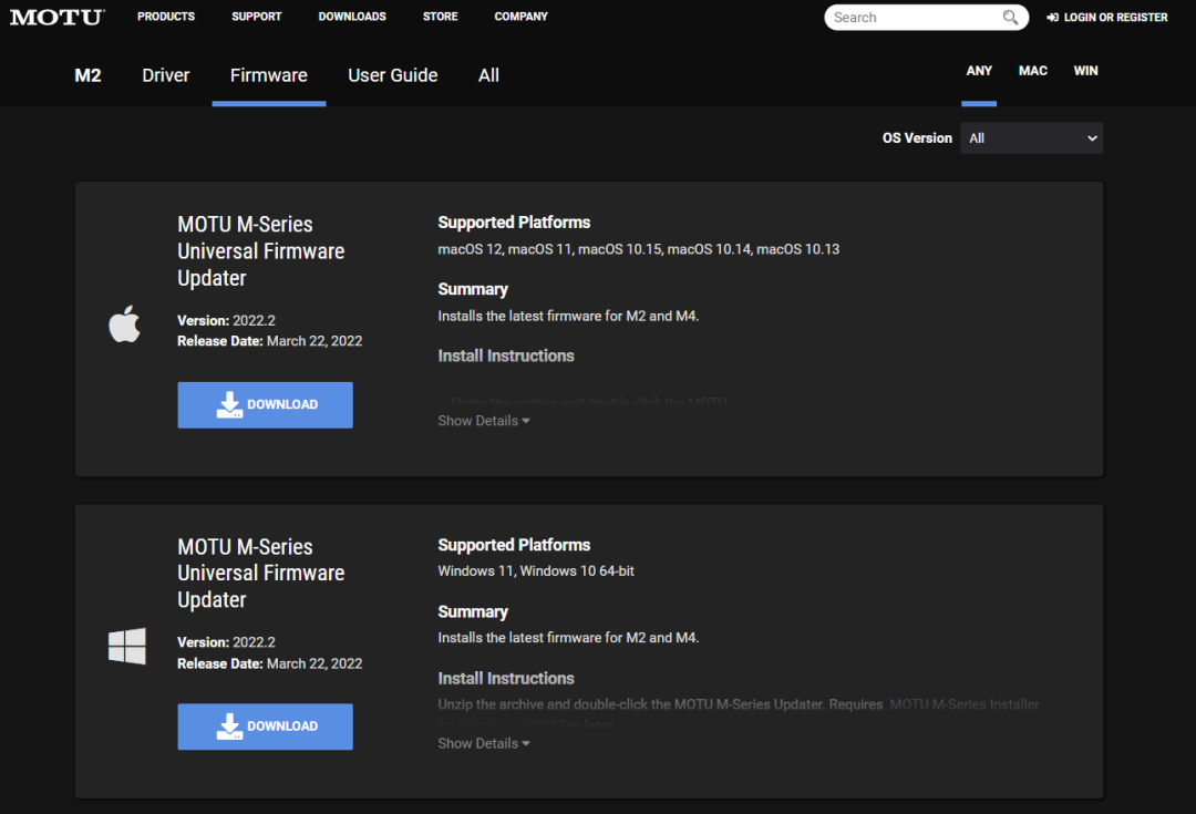 1、首先从MOTU官网下载固件升级程序,下载地址:https://motu.com/en-us/download/product/408/?platform_family=any&download_type=firmware#532