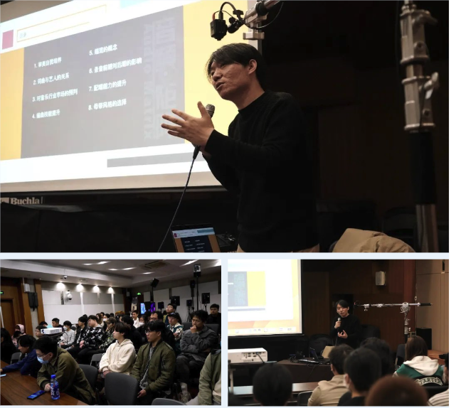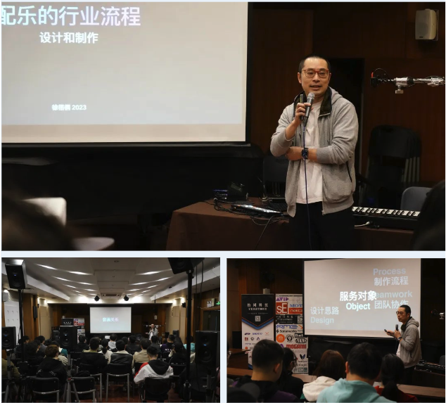 随后,音乐制作人徐梧桐以《配乐的行业流程—设计和制作》为主题,详细讲解了音乐设计和制作的行业流程,包括音乐选材、编曲、创作思路等各个环节,并结合实例剖析了音乐制作中所面临的挑战和应对策略。徐梧桐的演讲让同学们深刻了解了配乐制作的全过程,启发了同学们的创作灵感。